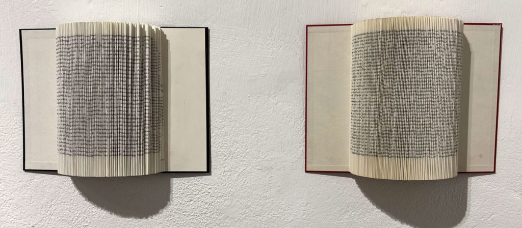 Oben: Wand mit Werken der beteiligten KünstlerInnen: Hannimari Jokinen • Katharina Kohl • Idit Elia Nathan • Dagmar Rauwald • Nir Alon